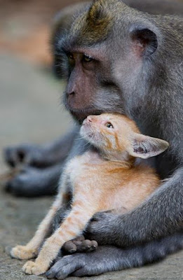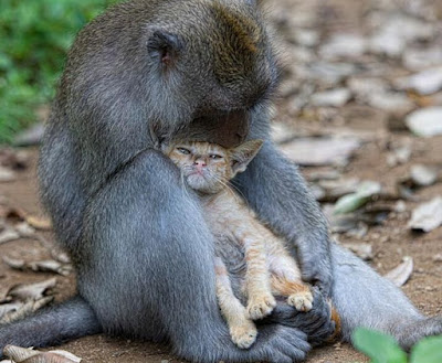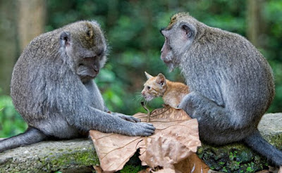 Οικογένεια μακάκος πήραν το γατάκι, το οποίο τώρα ζει μαζί τους. . .